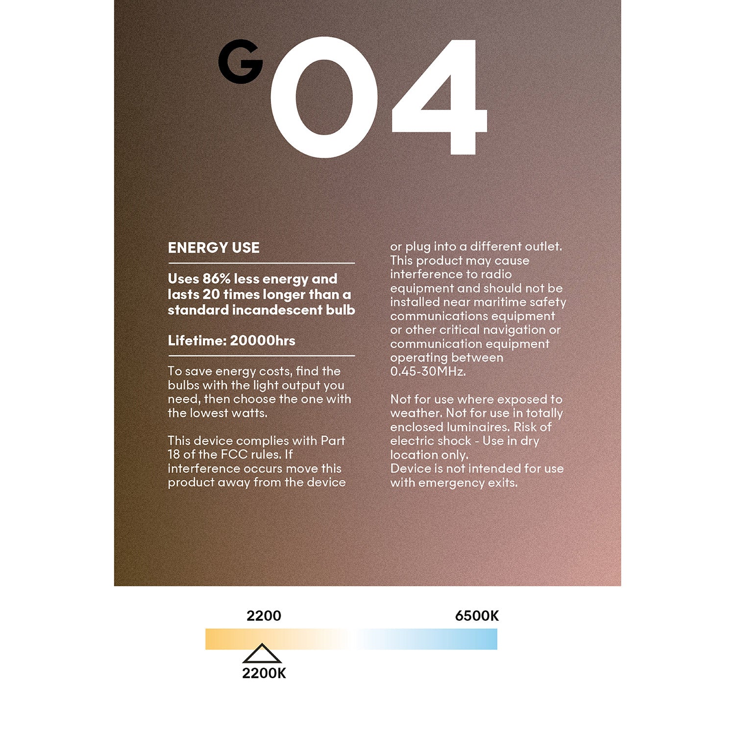 The G04 bulb is a refined creation designed to light up a space while adding a touch of modern sophistication. With its distinctive cube shape and unique light effect, it stands out as a design statement, even when turned off.