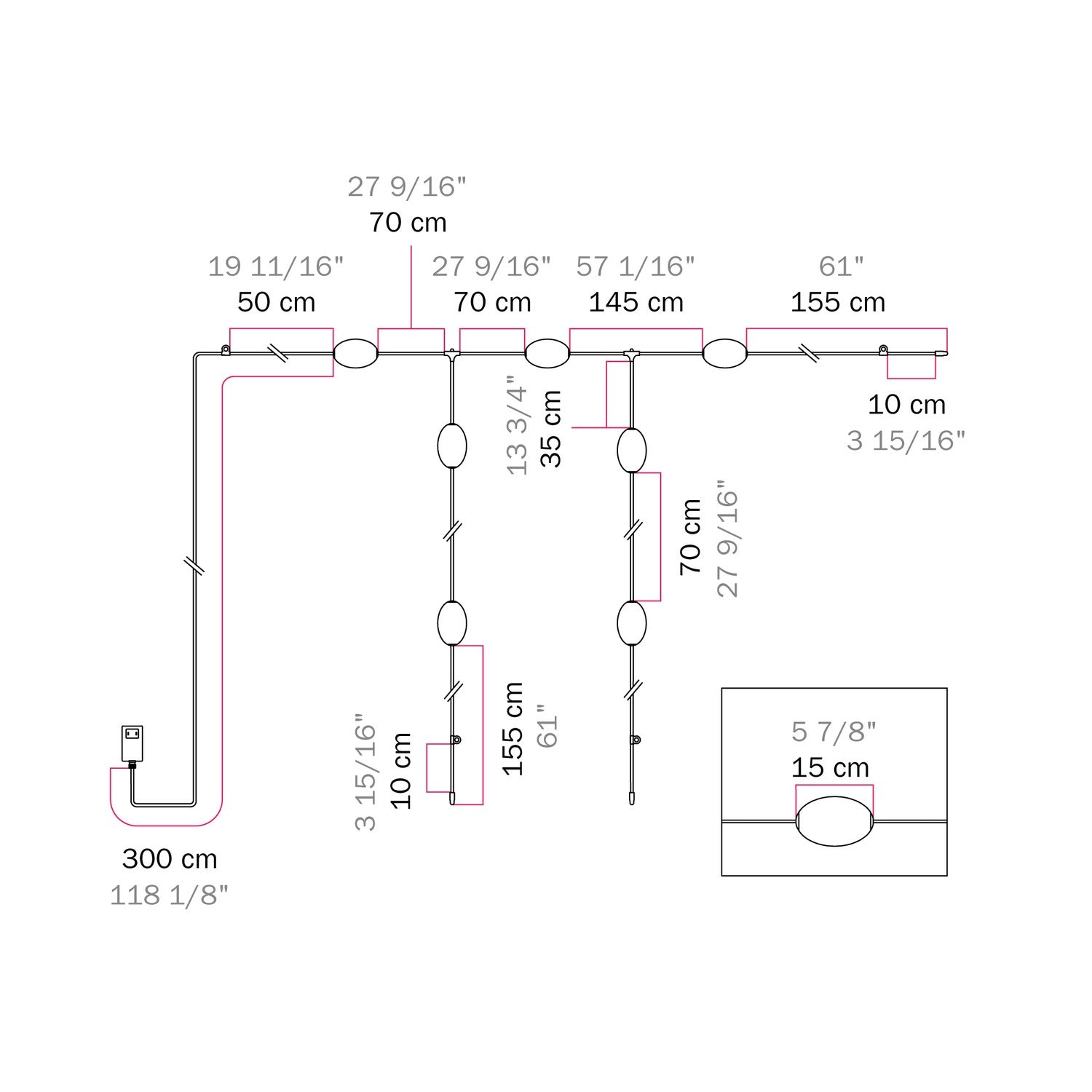 7 light points (bulbs included): LED, 7×2 W, 7×180 lm (1260 lm), warm light (2500 K), DC connector